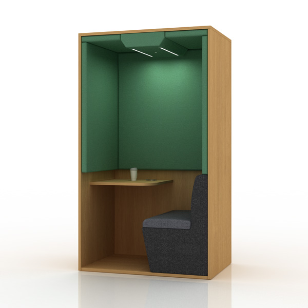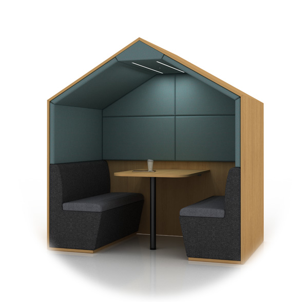Introducing Condo, your designated space for agile working, available as a solo corral, team meeting pod or media unit for video conferencing. Beautifully styled with a pitch or a flat roof contemporary design in natural Plywood or a multitude of MFC finishes. Completed with 58mm thick upholstered acoustic foam cladded panels to dampen the sound reverberations, deluxe backed soft seating and integrated desking and lighting; Condo creates a comfortable place to work whilst adding style and character to the workspace.