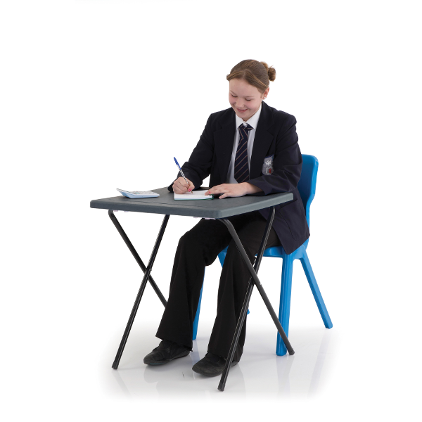 Large 600mm x 600mm working area with a 710mm working height. The tops are manufactured from a one piece recyclable injection moulded polypropylene. Exam desks can be laid out in the school hall more efficiently with less effort due to the unique ‘Snapping’ lock mechanism and the fact the Titan Exam Desks weigh up to 50% less than old fashioned wooden top exam desks. Extra strong oval steel frame, pen groove, folds neatly away when not in use and can be stored in the Titan Examination Trolley which has a capacity of 40 desks.